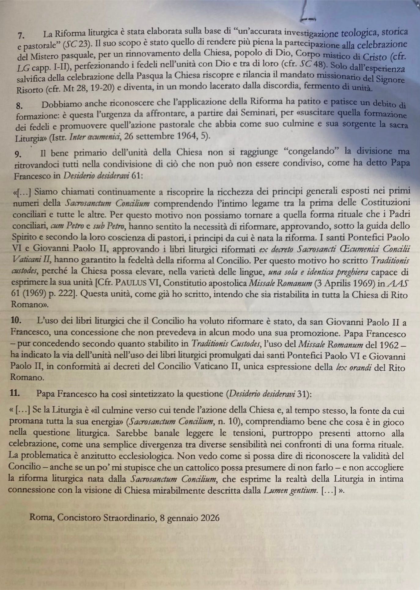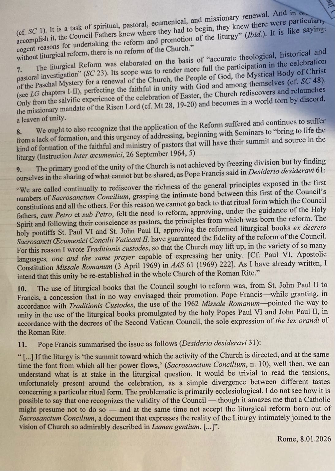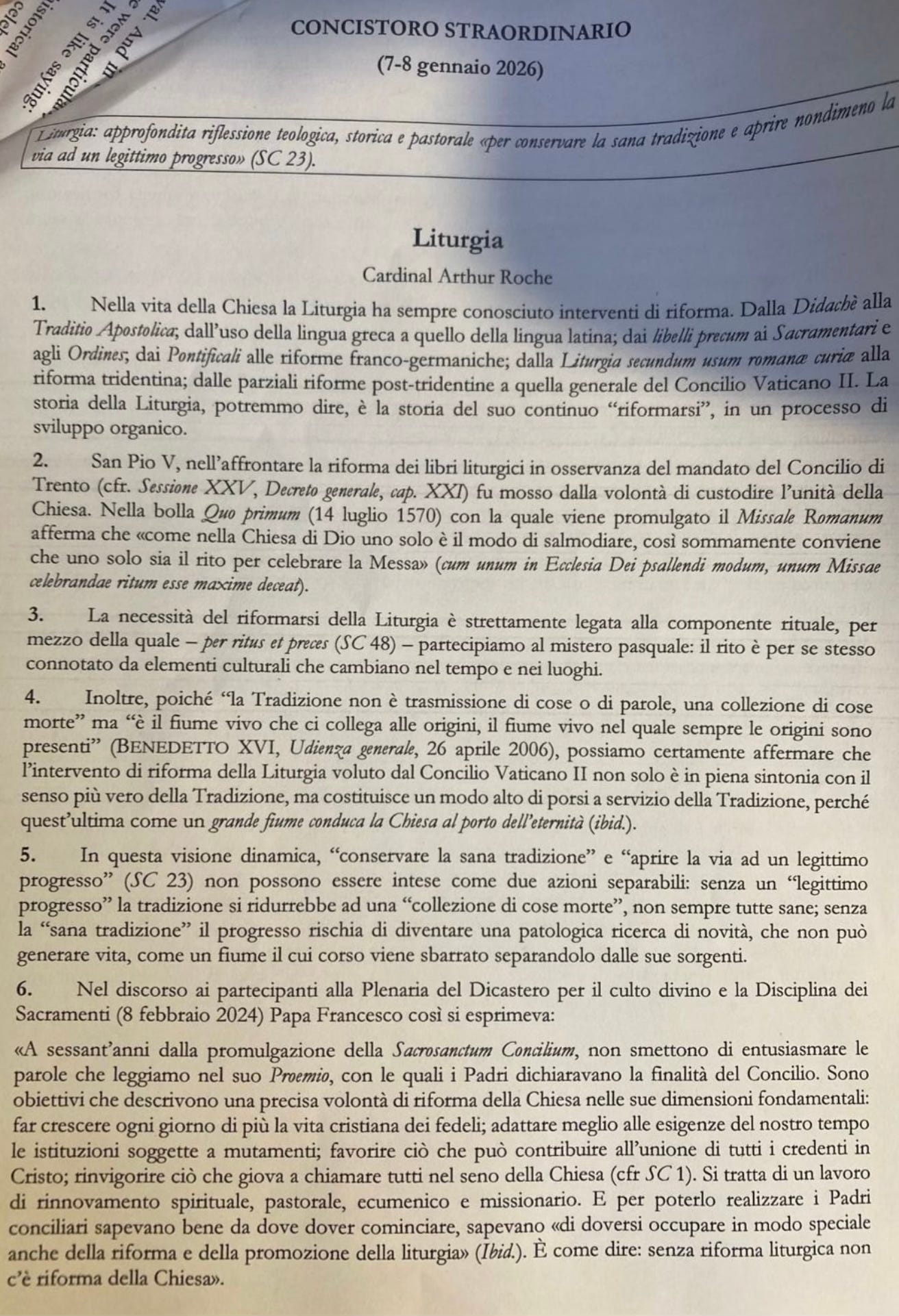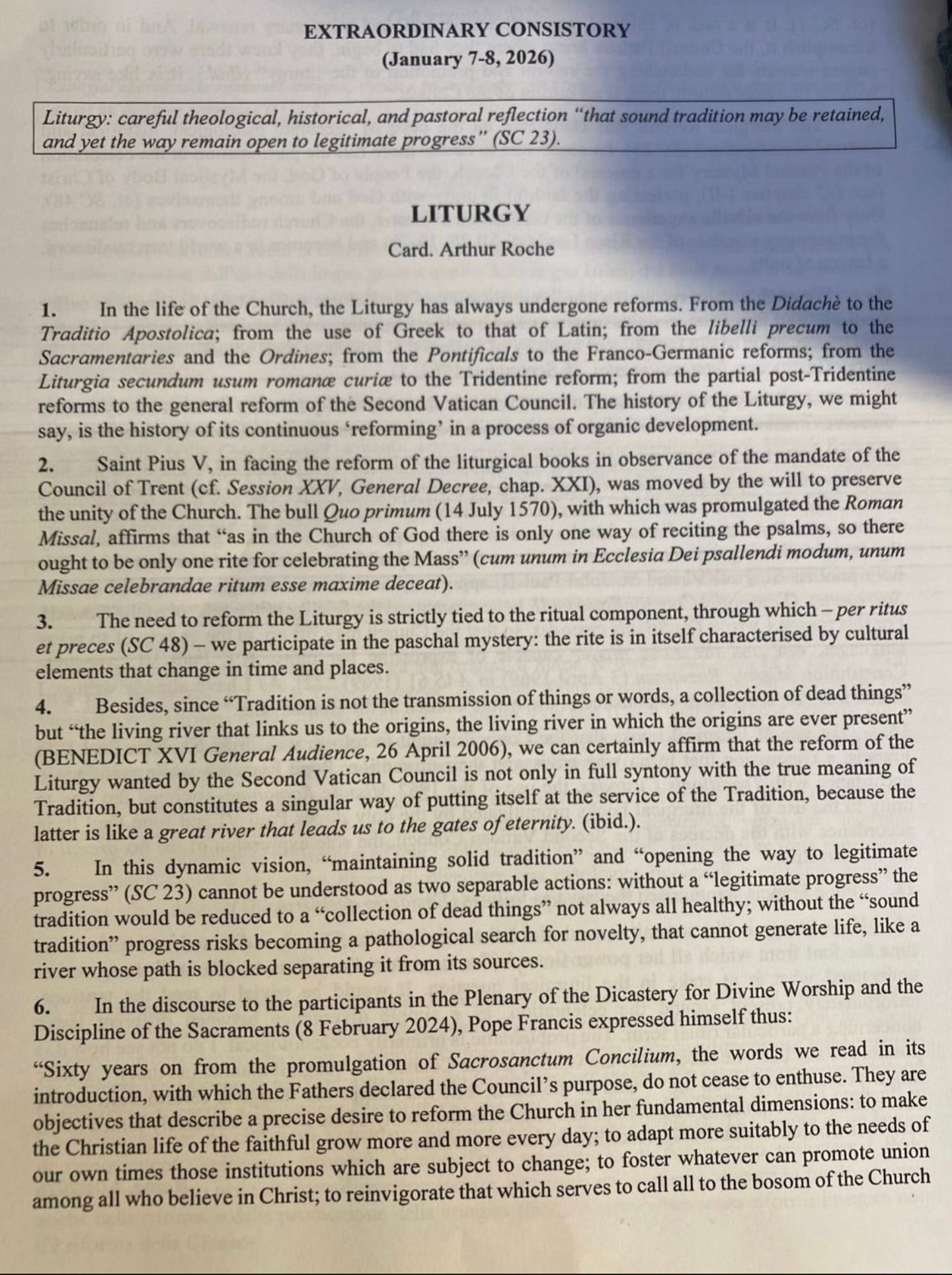 ROME, 13 January 2026 — A previously undisclosed text on the liturgy, prepared by Cardinal Arthur Roche and distributed to Cardinals at last week’s Extraordinary Consistory, has now come to light. In it, the Prefect of the Dicastery for Divine Worship and the Discipline of the Sacraments mounts a strong defense of Traditionis Custodes, revealing that the traditional Latin Mass was squarely on the agenda of the meeting.