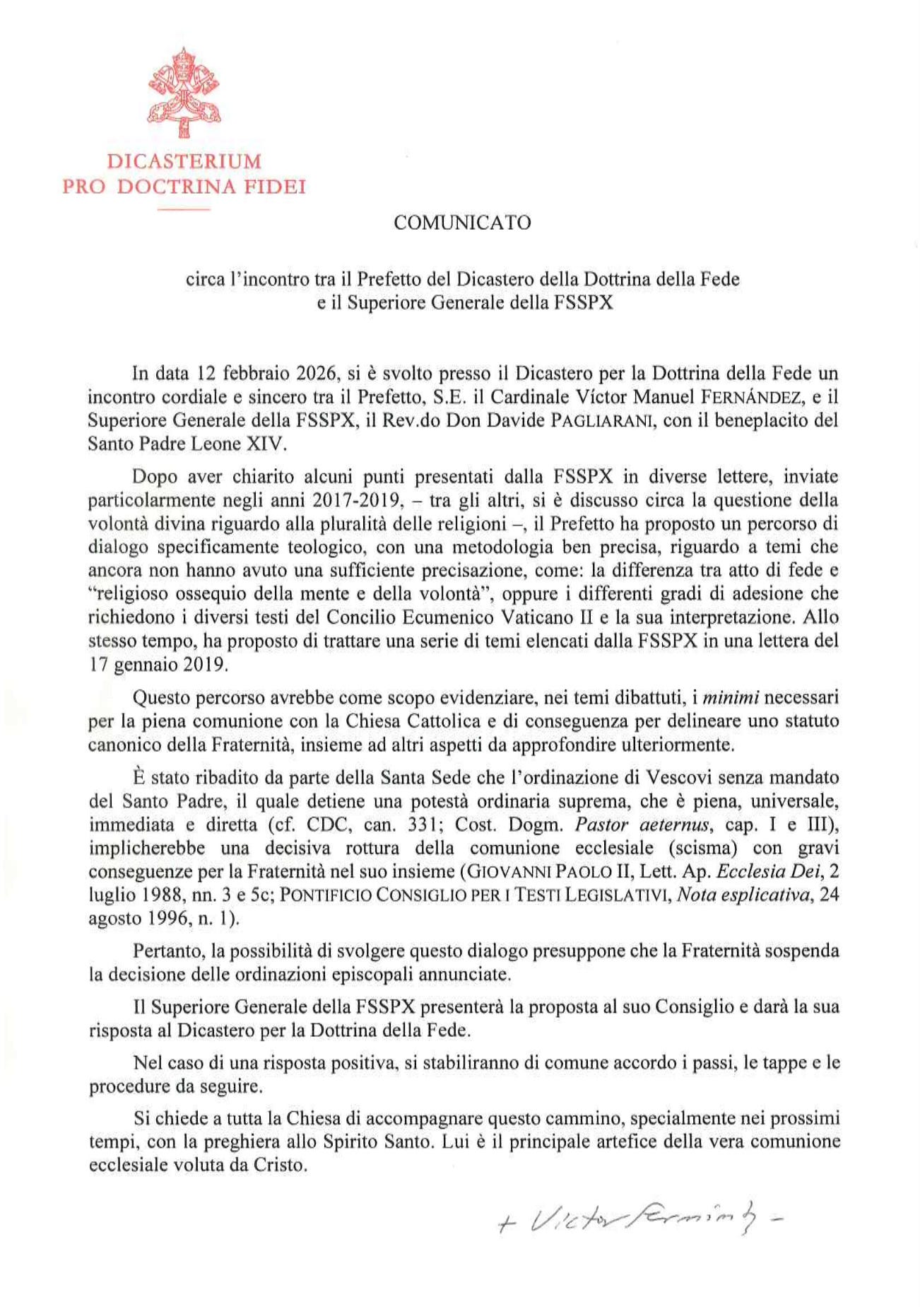 On 12 February 2026, a cordial and sincere meeting took place at the Dicastery for the Doctrine of the Faith between the Prefect, His Eminence Cardinal Victor Manuel Fernández, and the Superior General of the FSSPX, Reverend Don Davide Pagliarani, with the approval of the Holy Father Leo XIV.